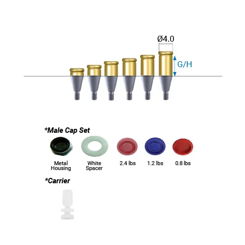 It comes as set of abutment and male cap set including metal housing , spacer and 3 different retention caps